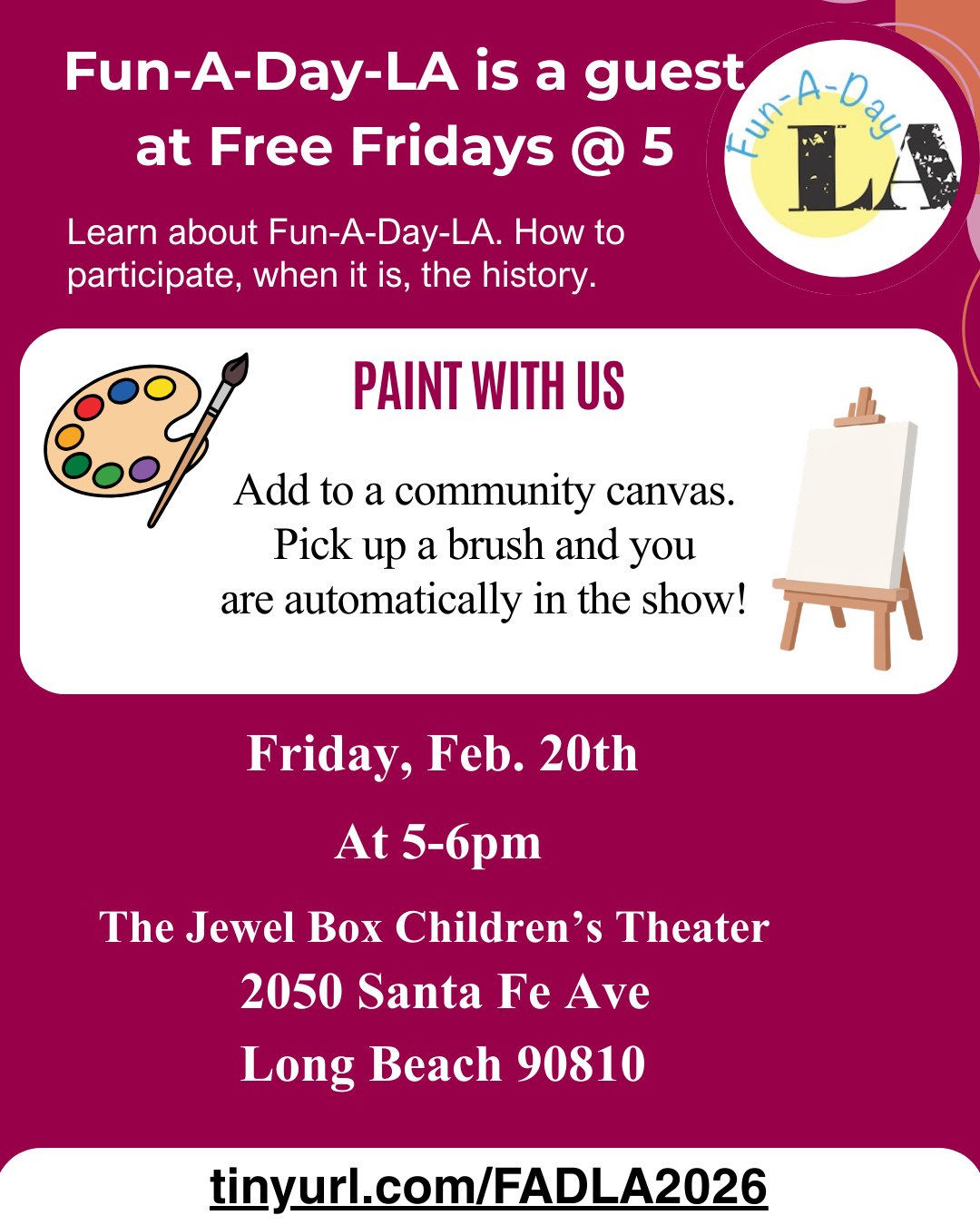 All ages, adults, teens, children are invited to participate in this free art activity. No skills required, no art experience required, actual painting not even required! So see you on 2/20 at 5pm at The Jewel Box Children’s Theater 2050 Santa Fe Ave, LB 90810.